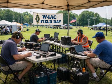 Amateur radio operators conduct Field Day by setting up temporary stations away from their usual home shacks, often in parks, community centers, or open fields, to simulate emergency operating conditions. Working individually or as a club, they erect portable antennas, connect radios to generators, batteries, or solar power, and establish logging systems to track contacts. Once on the air, operators rotate through shifts for a continuous 24-hour period, making as many contacts as possible across multiple bands and modes such as voice, Morse code, and digital. Along the way, they practice message handling, test backup power systems, and often invite the public to observe and learn about how amateur radio can provide dependable communication when normal infrastructure is unavailable.